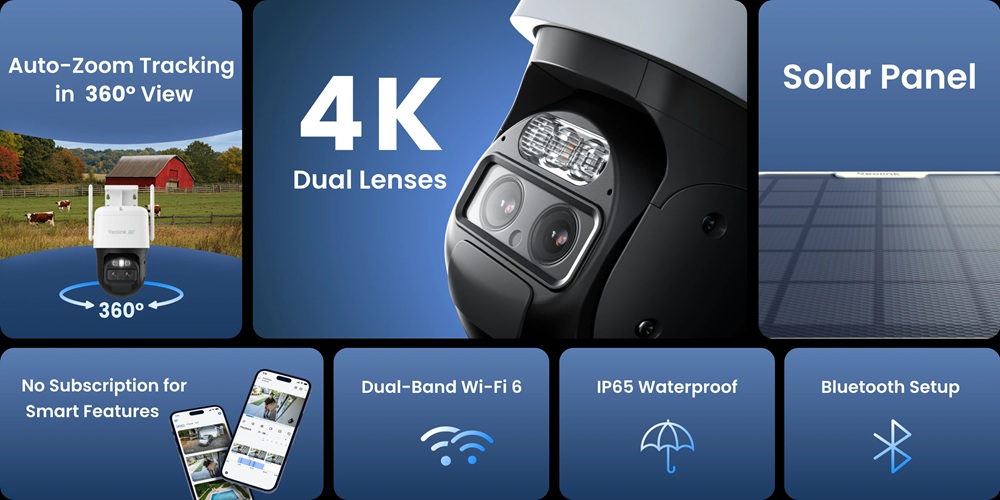 Dual-lens PTZ-camera | Dual-Band WiFi | Batterij plus zonnepaneel | Auto-Zoom tracking