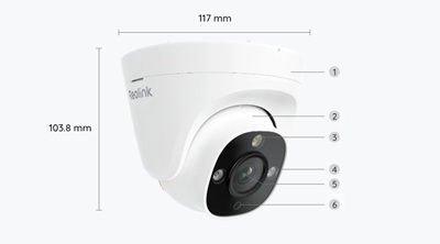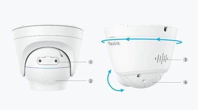 | 1) Bevestiging; 2) Behuizing; 3) Spotlight; 4) Infrarood LED's; 5) Lens; 6) Daglichtsensor | 1) Micro SD-kaartslot; 2) 'Omhoog'-markering; 3) Luidspreker; 4) Ventilatie |