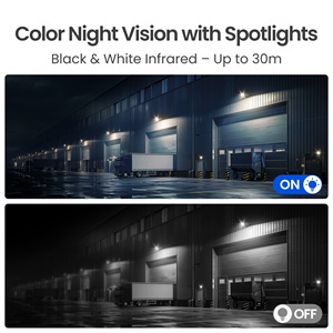 - Flexibele belichtingsopties. Camera schakelt 's-nachts automatisch over op infrarood voor heldere zwart-witbeelden (tot 30 meter zicht) en met de spotlights aan heb je full-color kleurennachtzicht. Keuze uit drie spotlightmodi - Altijd aan, Alarm geactiveerd en Handmatig uit – om aan je behoeften te voldoen;
