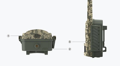 | 1) Lens; 2) IR LED's; 3) Temp/luchtvochtheidsensor; 4) Antenne; 5) Microfoon; 6) CDS & TEST indicator | 1) Speaker; 2) USB-C poort; 3) Achterklep slot |