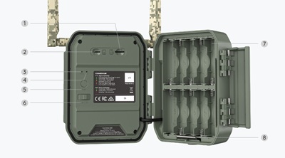 | 1) MicroSD Card slot; 2) Nano SIM Card slot; 3) Stroom indicator; 4) Signaal indicator; 5) Test & Resetknop; 6) Stroom schuifknop; 7) Batterijcompartiment; 8) Batterijcompartimentslot |